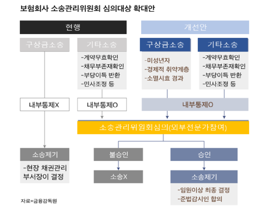 시하고 있으나 차후 내부 소송관리위 개최 및 소송심의 건수와 승인·불승인 건수 등 심의 결과까지 공시해야 하는 부담까지 않게 되었다. 소송 제기·채권 추심 시 취약계층을 보호하기 위해 보험사별 내부 통제 장치도 강화된다.